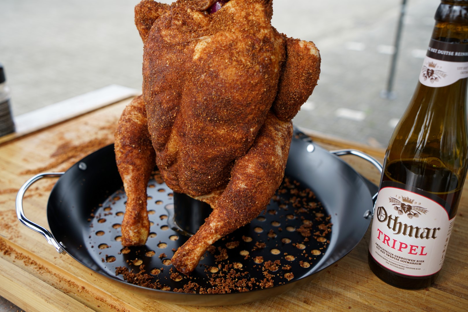 garlic cloves, thyme sprigs and sage. fill it then to the brim with beer. Lubricate the chicken lightly with olive oil and then with the Grate Goods rub. Slide the chicken, upright, over the tray. Close the top of the chicken with a red onion. Make sure that it is properly closed, so that the beer steams through as much as possible. Place the chicken in the center of the preheated BBQ (approx. 180 degrees, burners on medium), with the hood closed. Now wait until the chicken is cooked (on average about 45 minutes).